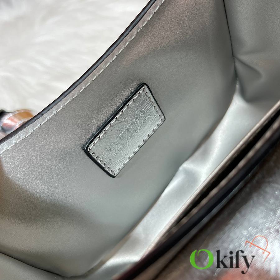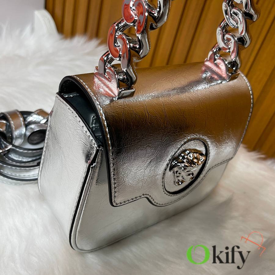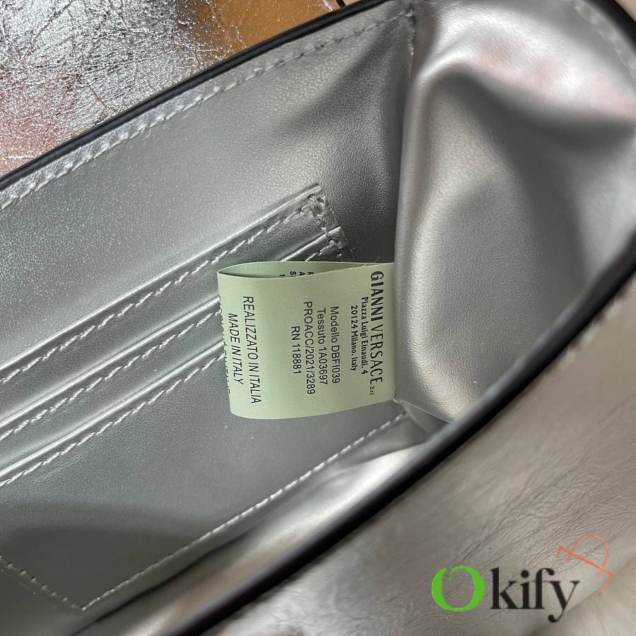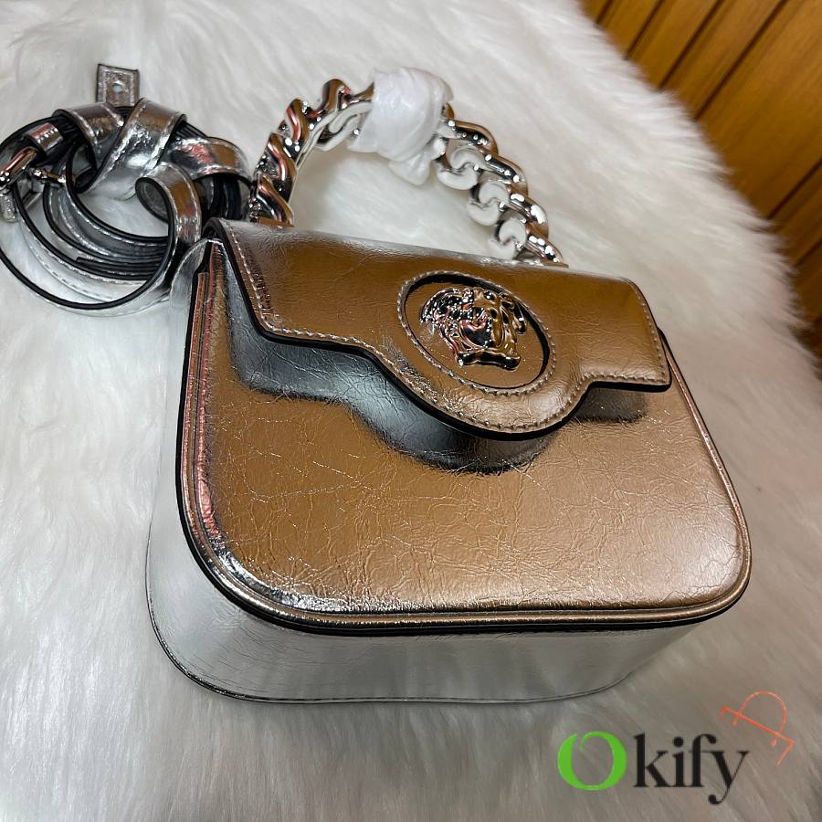 A modern turn, encounter the denim Medusa! A surging, trendy attitude, the striking gold Medusa panel and handle add a touch of chic. The central Medusa is highly recognizable. The design features a fixed chain top handle, and a detachable, adjustable shoulder strap is also available. Three internal card slots.