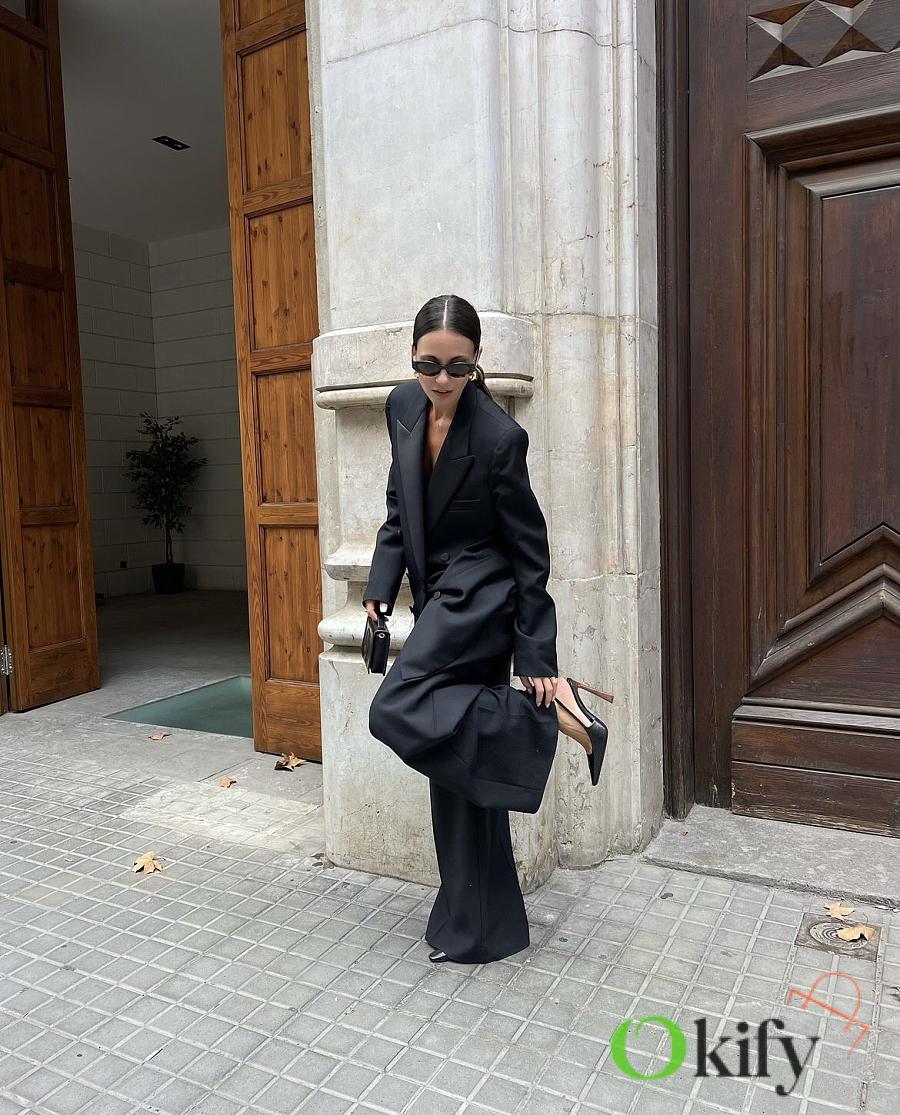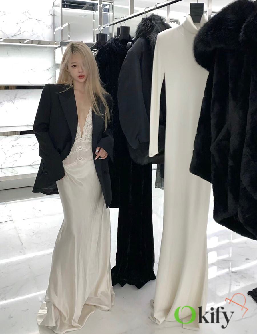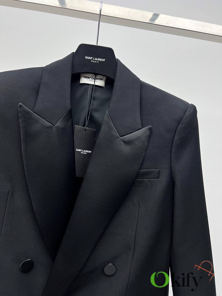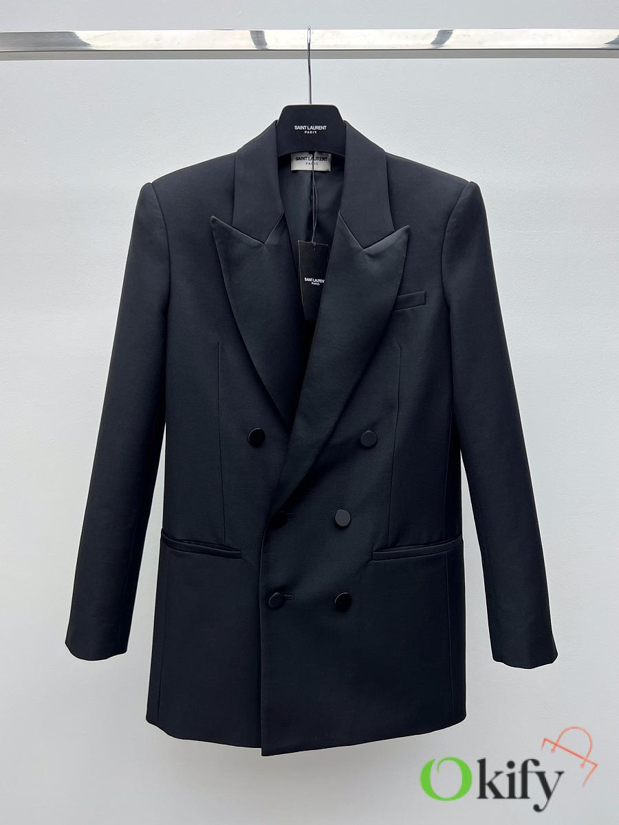 Classic double-breasted smoking suit Acetate stitching gun collar full of aura Six satin-covered buttons and two patch pocket details Sexy and charming with a long skirt