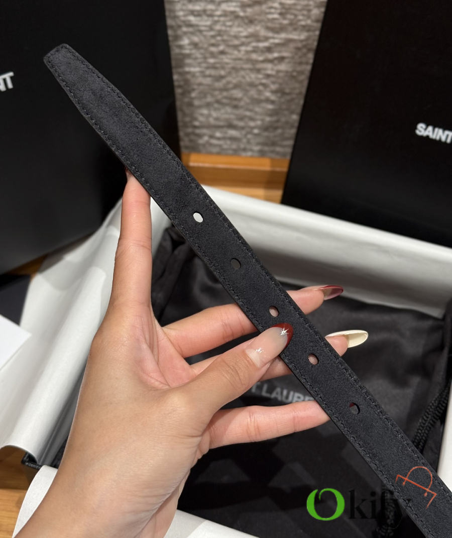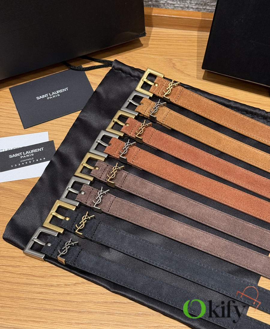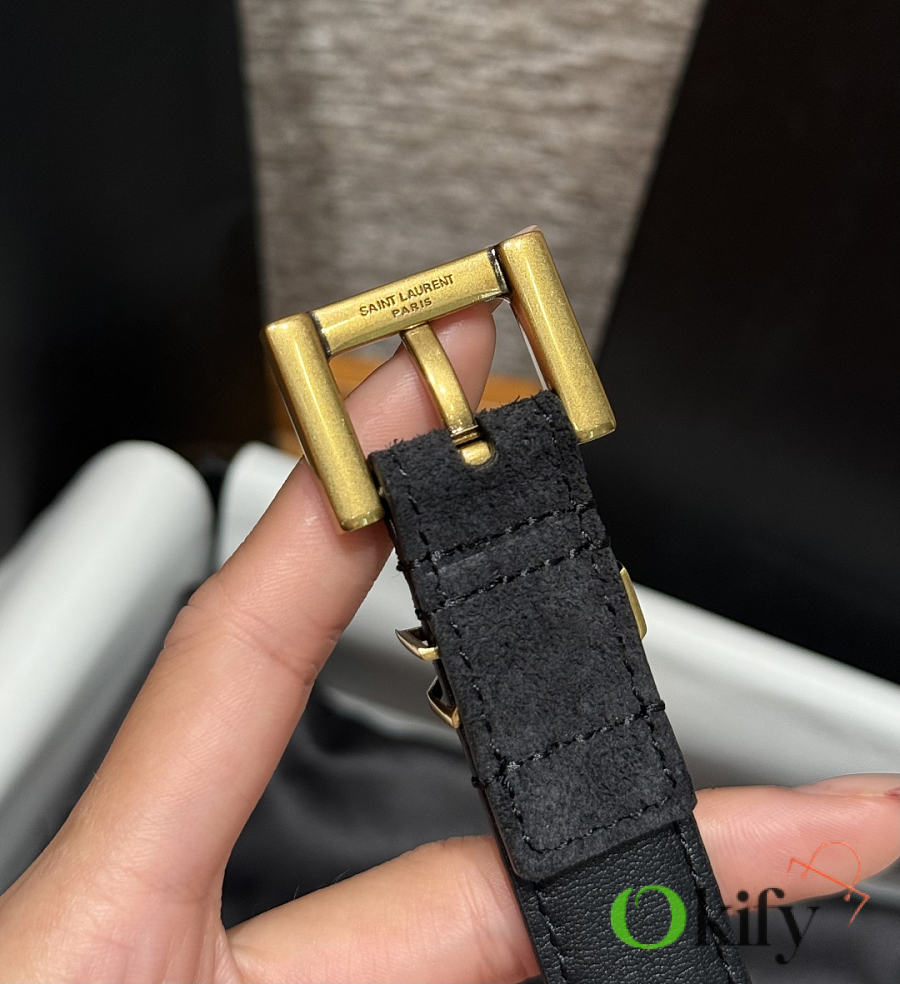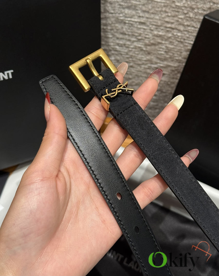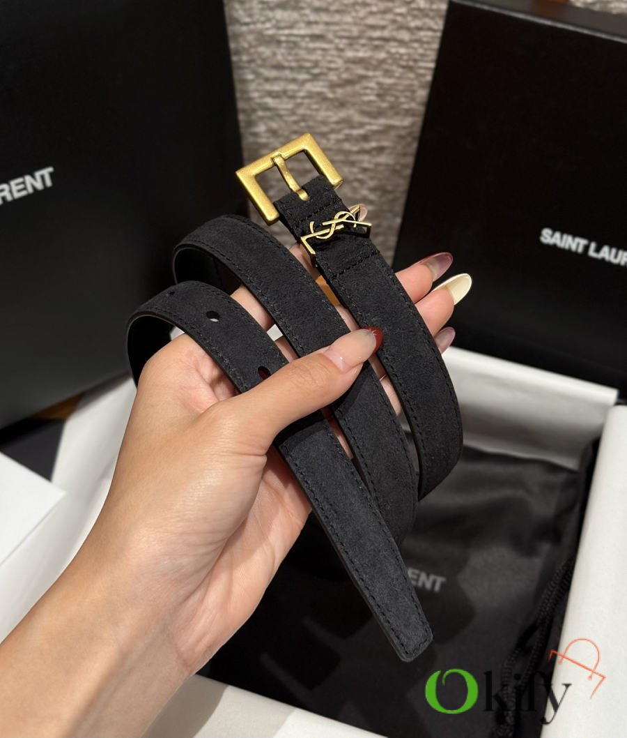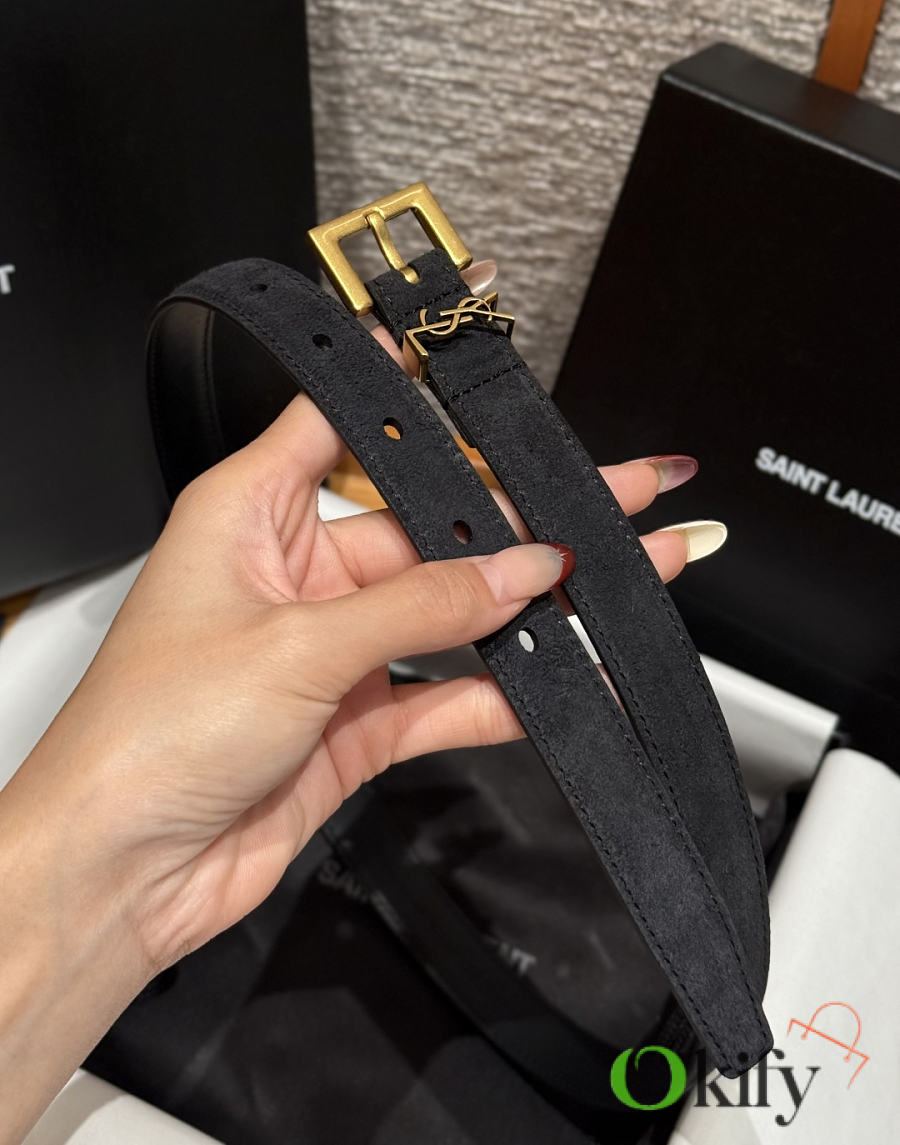 This belt features a suede design with a calfskin back, exuding a premium feel. It's adorned with a retro-style square buckle with the brand logo. A simple and versatile piece, it easily complements various styles, giving off a sophisticated and elegant look