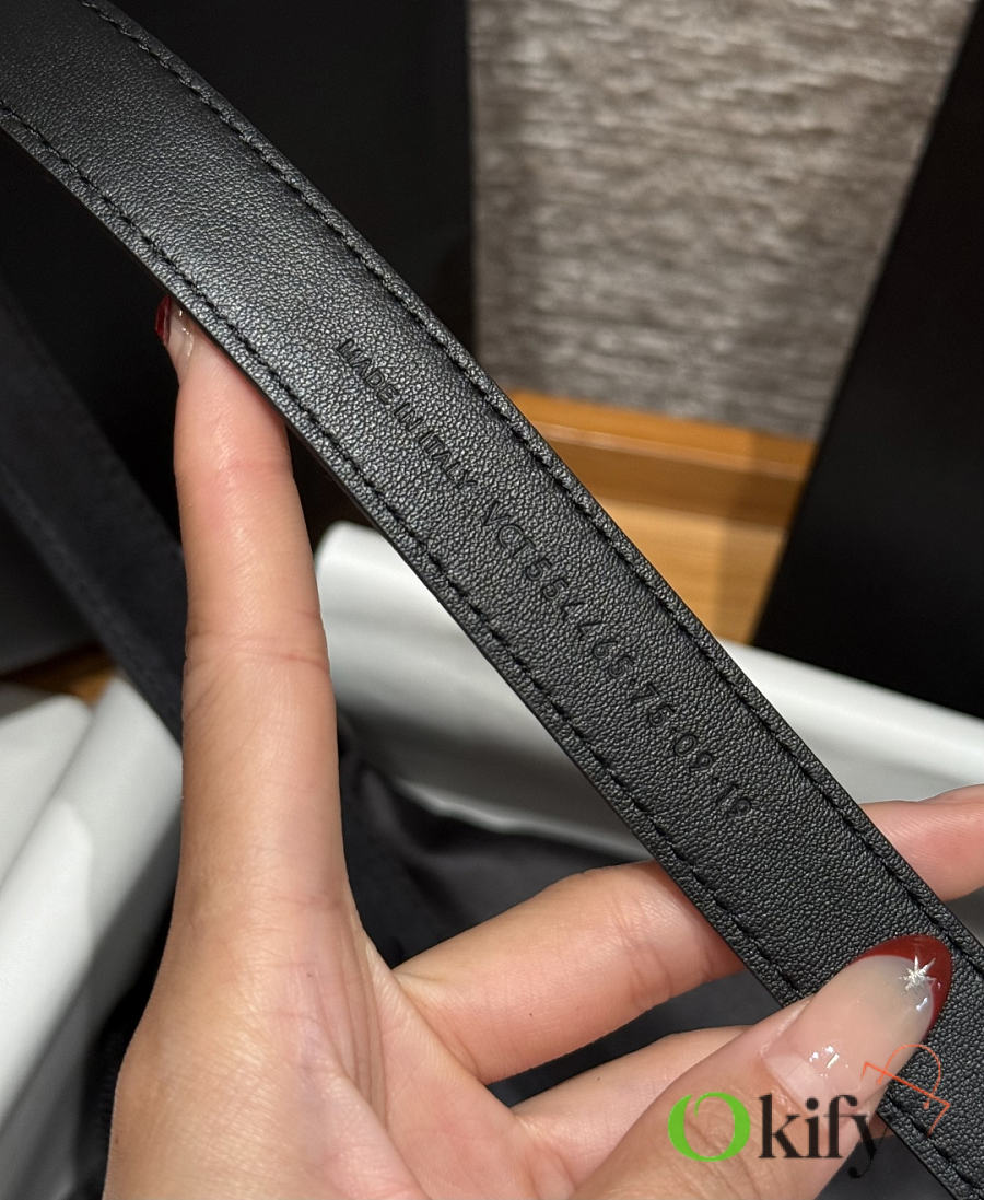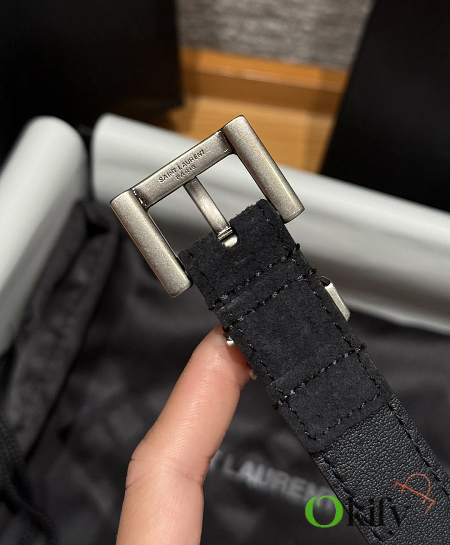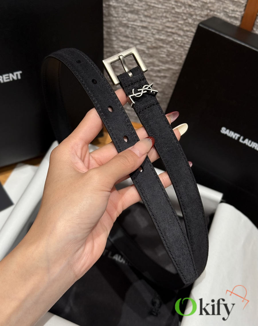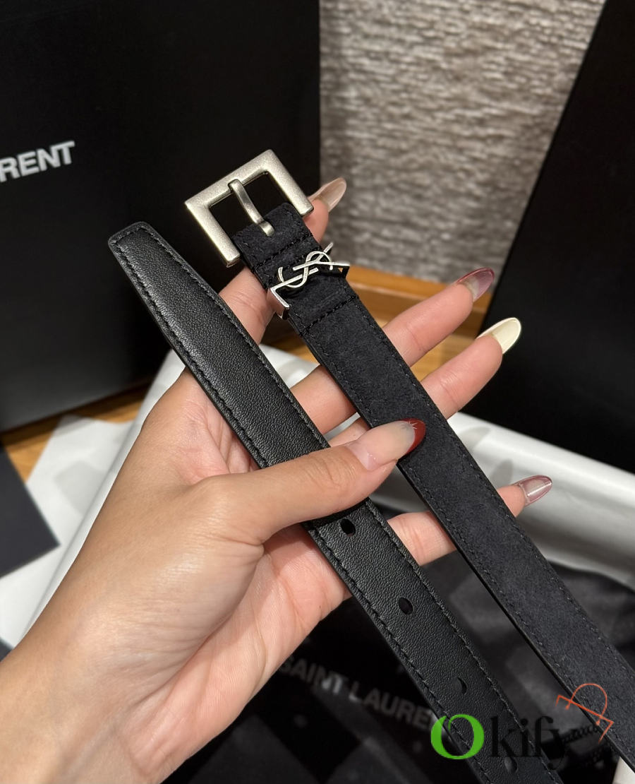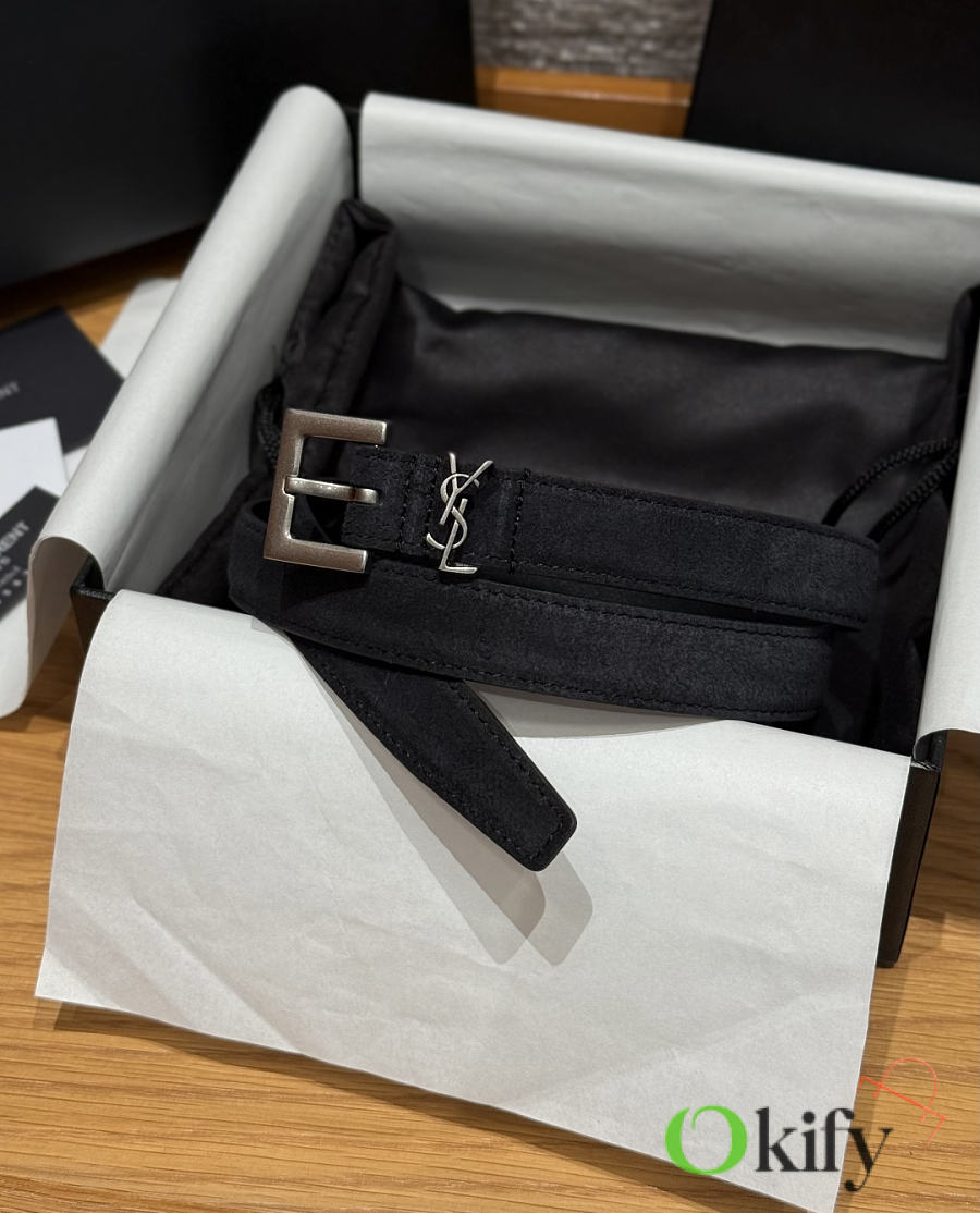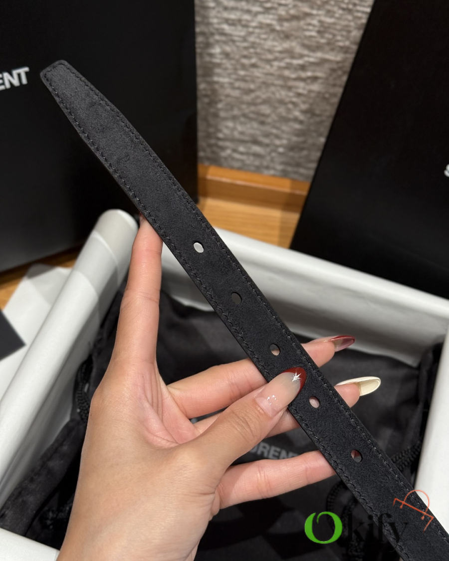 This belt features a suede design with a calfskin back, exuding a premium feel. It's adorned with a retro-style square buckle with the brand logo. A simple and versatile piece, it easily complements various styles, giving off a sophisticated and elegant look