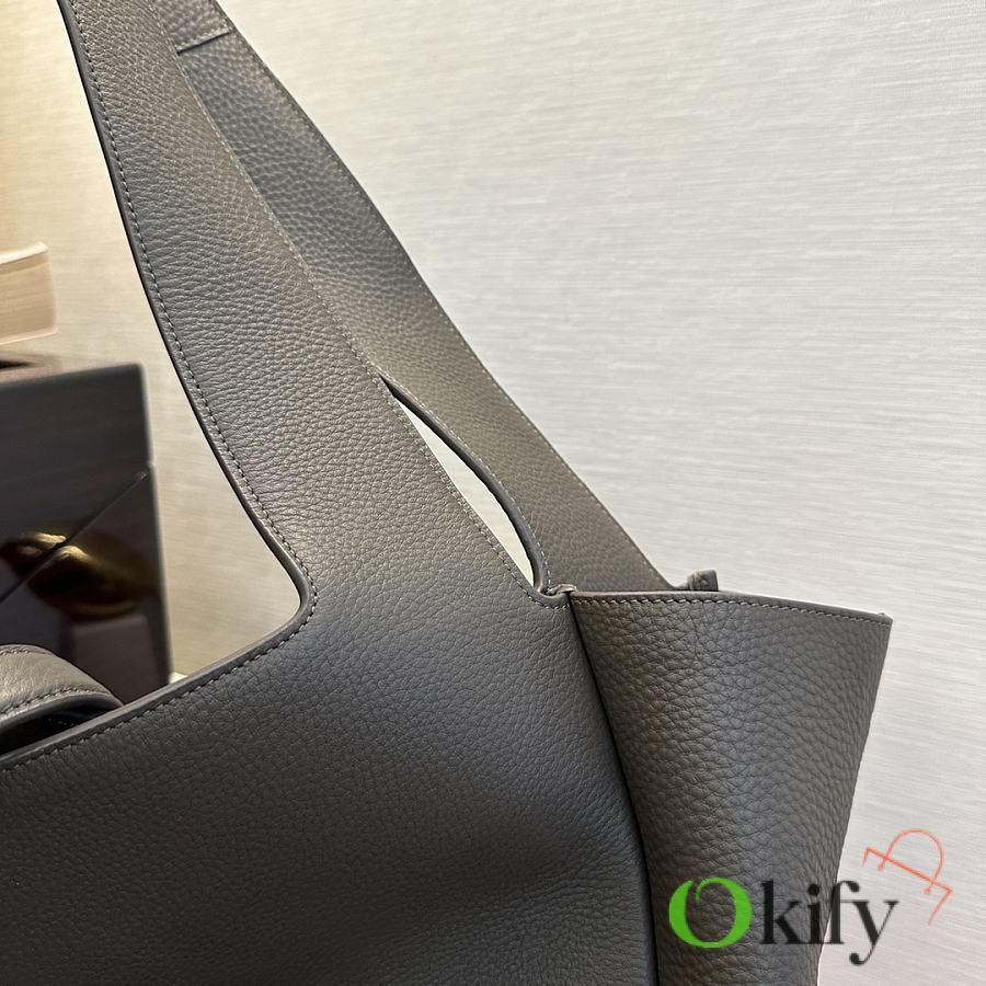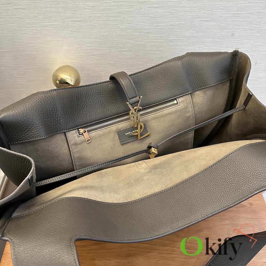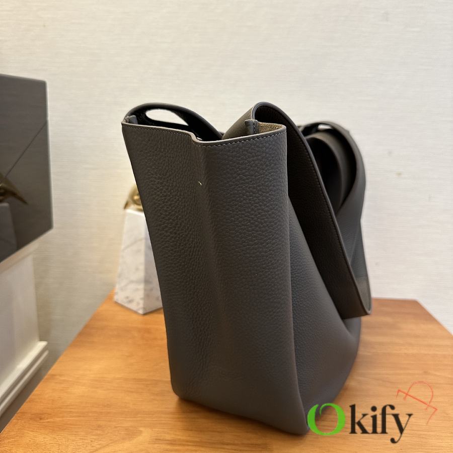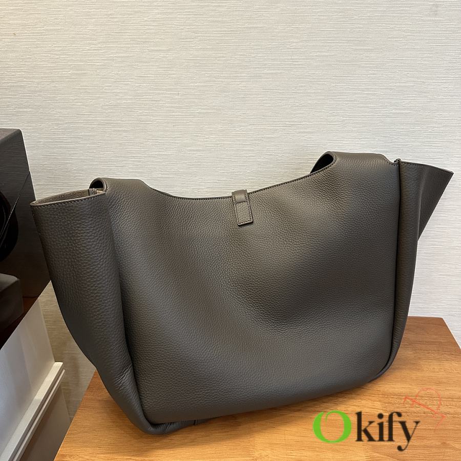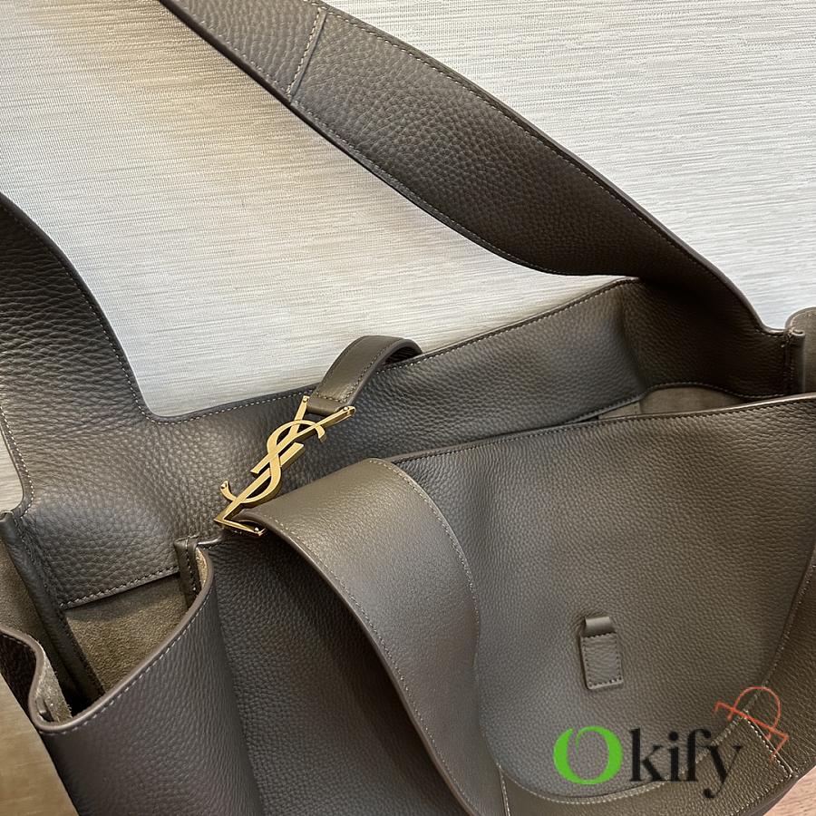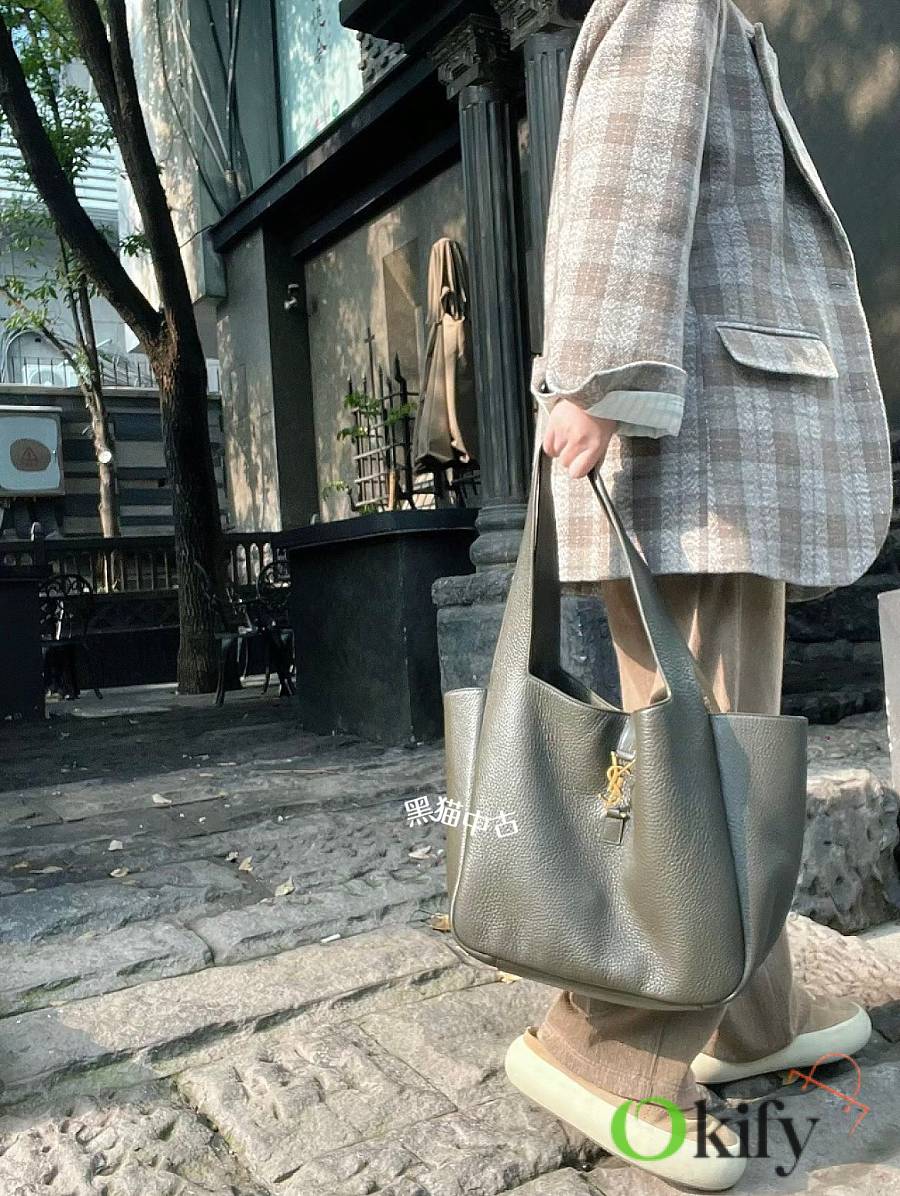 The À tote bag is available in a horizontal style, featuring a leather buckle closure and adorned with LE CASSANDRE. It offers ample space, features a matching suede lining, a main compartment and an interior zip pocket, an internal drawstring design, and foldable or unfoldable sides as needed. Perfect for daily commutes!
