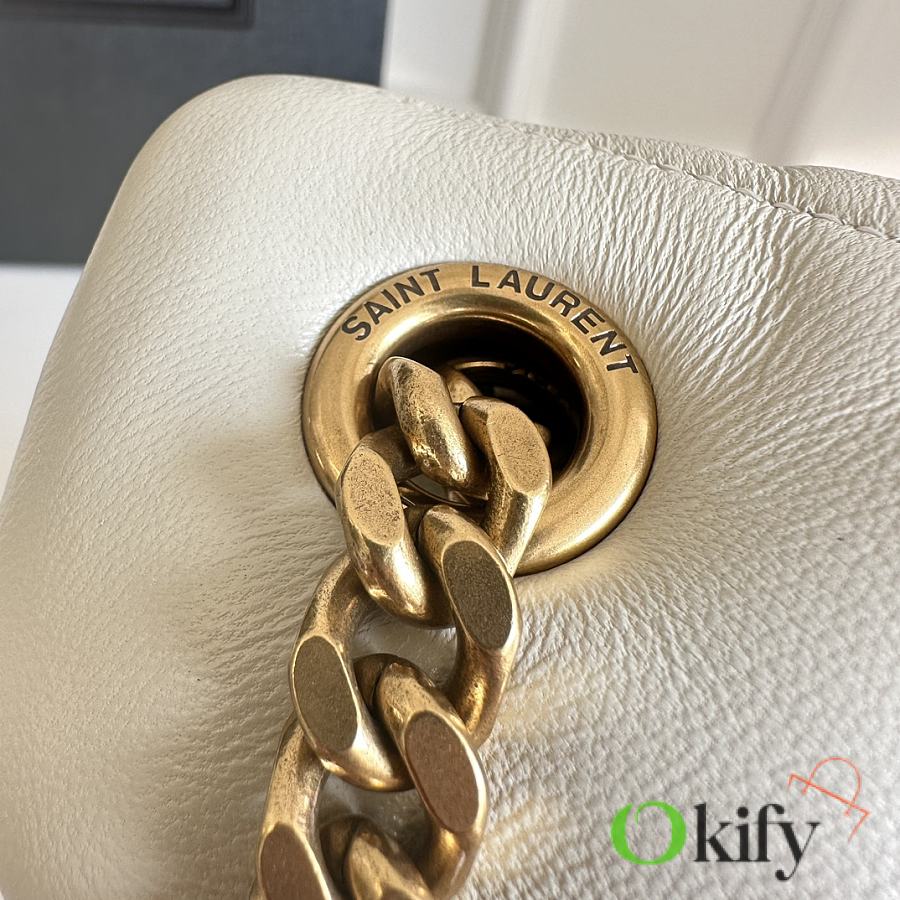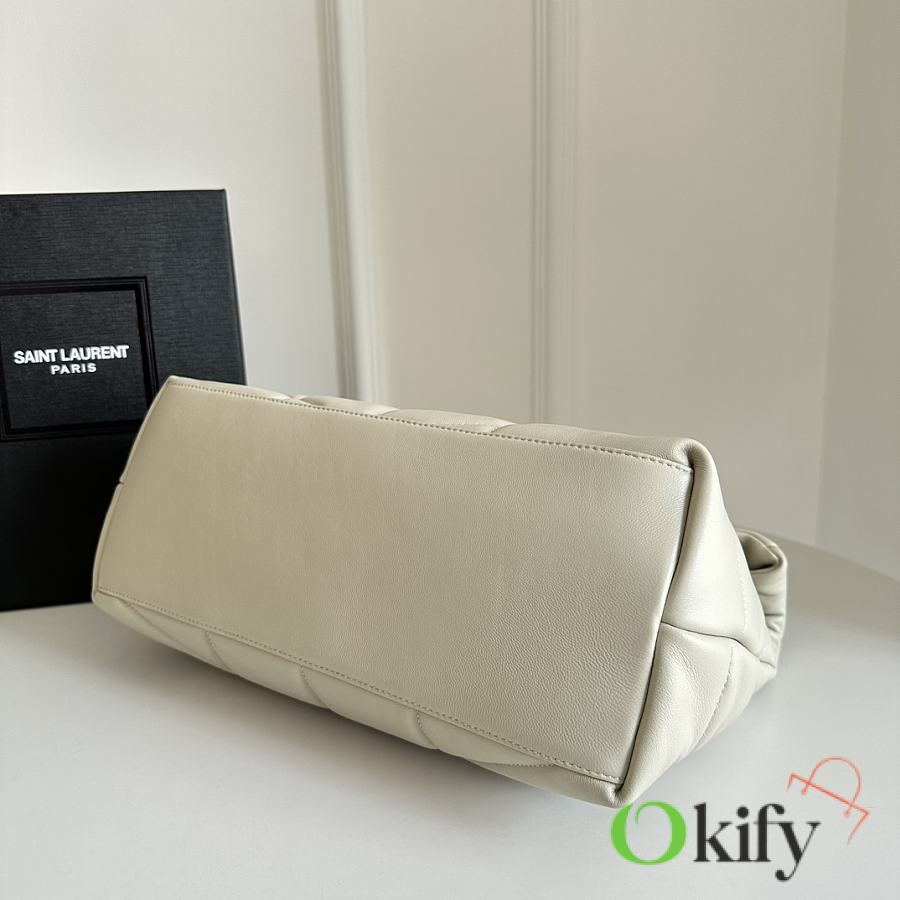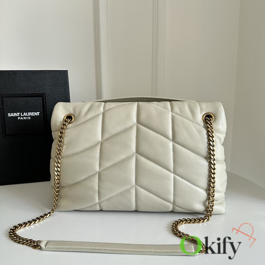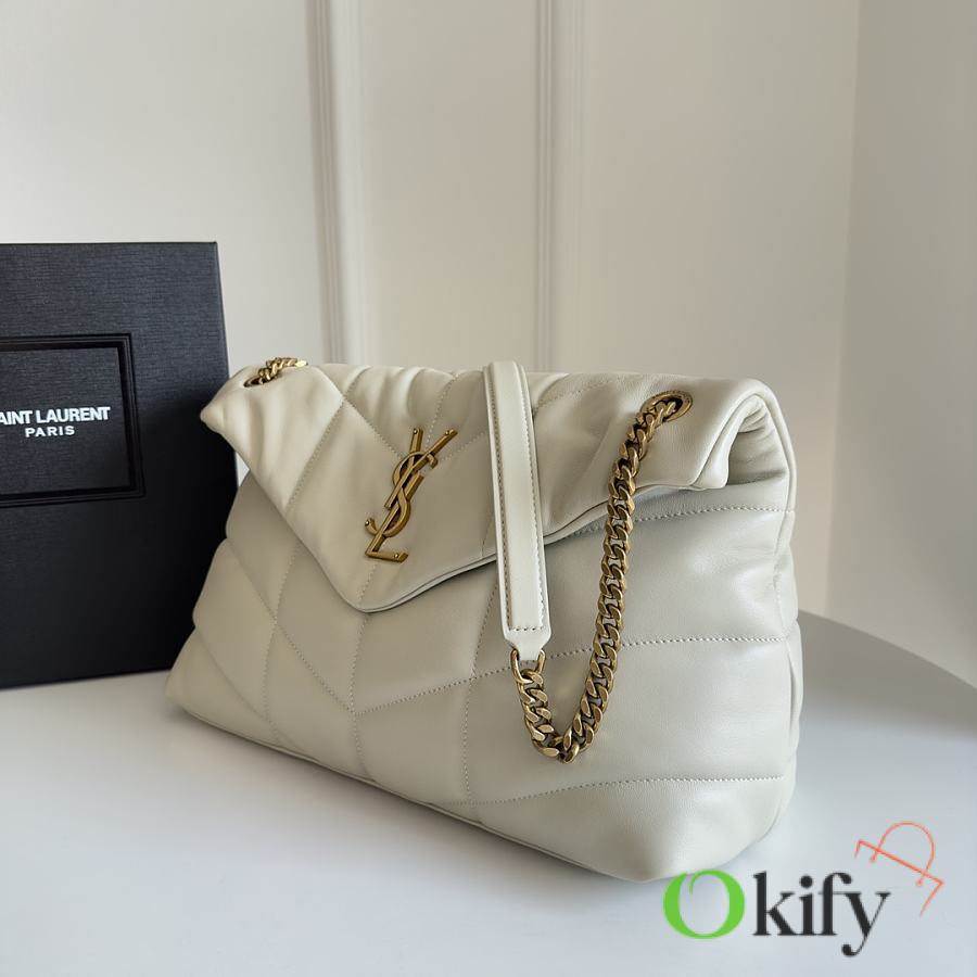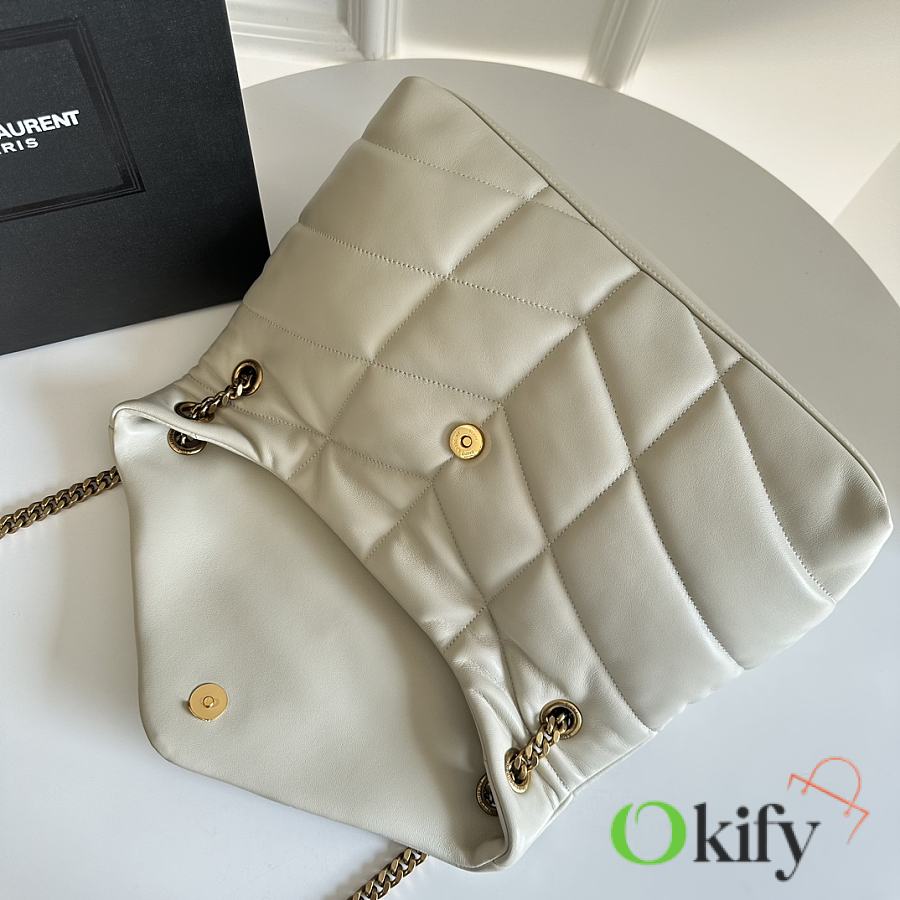 The YSL LOULOU Cloud Bag is a quilted lambskin bag made from genuine leather, with a soft and delicate feel, like cradling a cloud. The classic YSL logo, chain, and eyelet hardware are all in matte silver gold. The bag's opening is sealed with a magnetic snap closure, ensuring excellent sealing and security. Inside, there's a zippered pocket for your phone and valuables, and no other pockets, making it incredibly versatile.