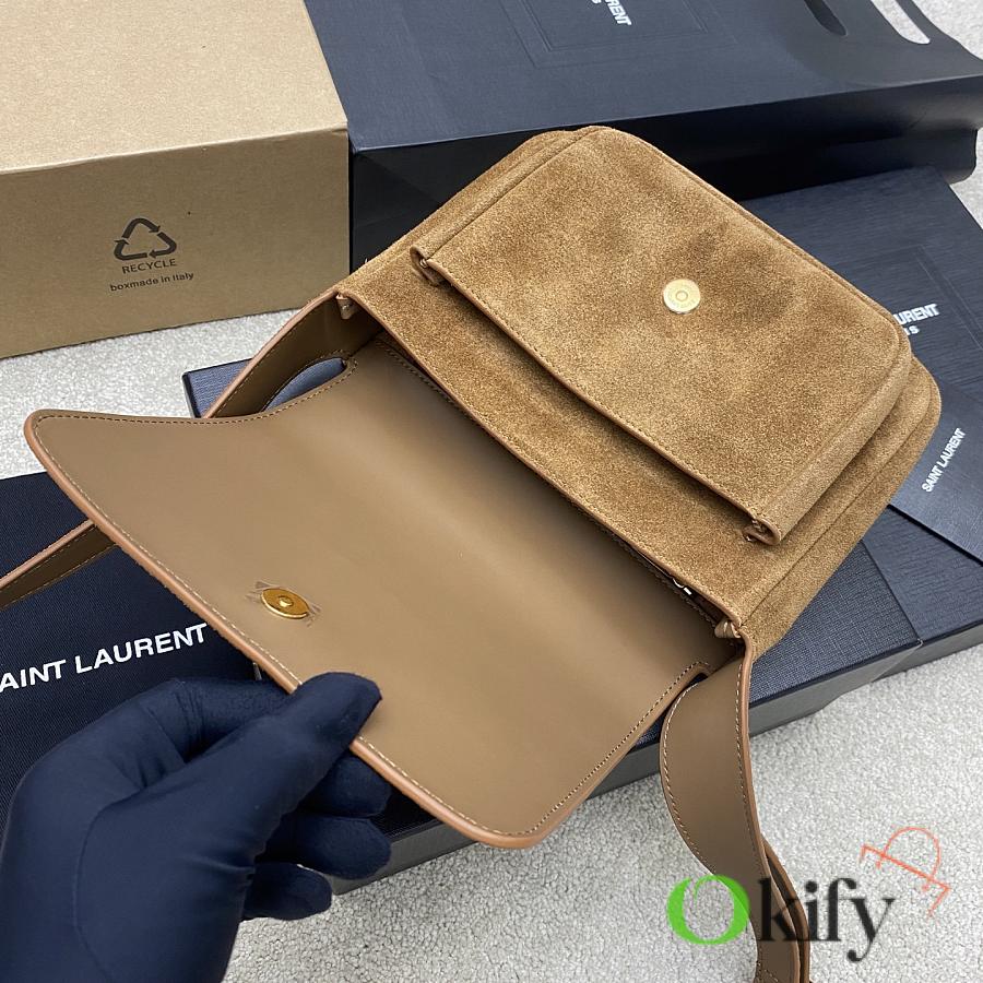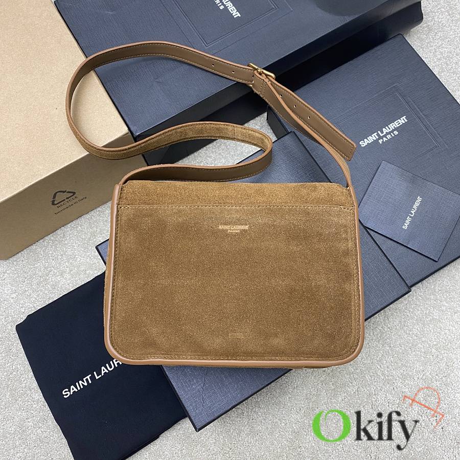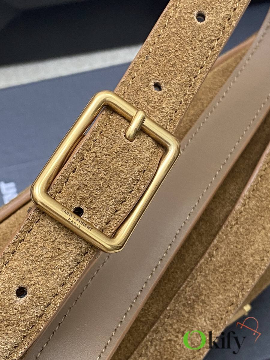 This new Saint Laurent Niki handbag comes in a unique new Besace saddle shape, crafted from caramel brown vegetable-tanned calfskin, featuring a soft heart-shaped flap closure and a YSL gold logo clasp. The bag offers two compartments and an adjustable shoulder strap, perfect for bohemian outfits or the Maillard look ideal for fall and winter, exuding a retro yet chic vibe.