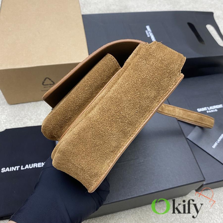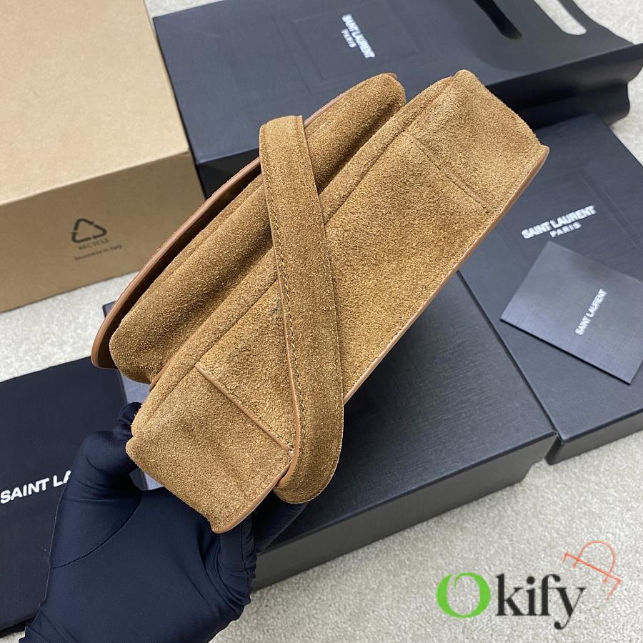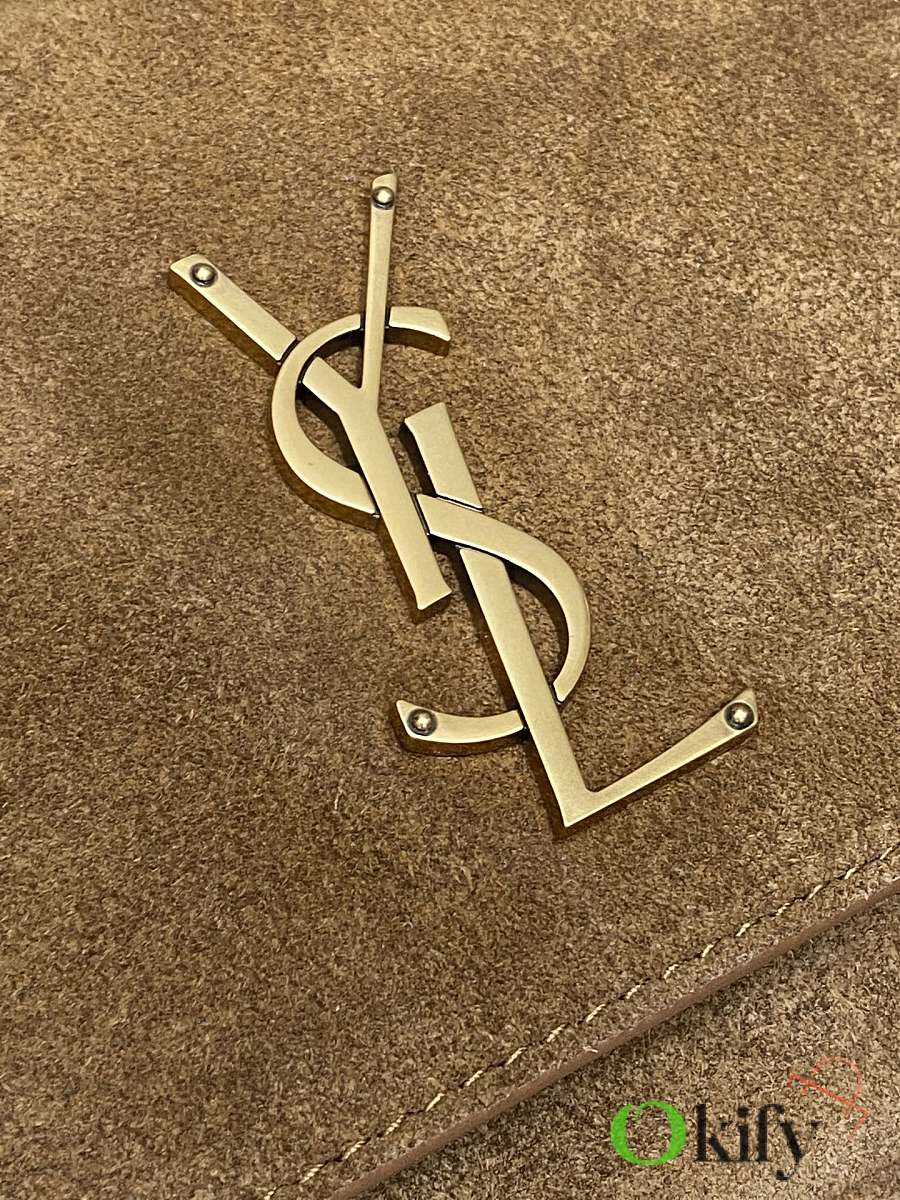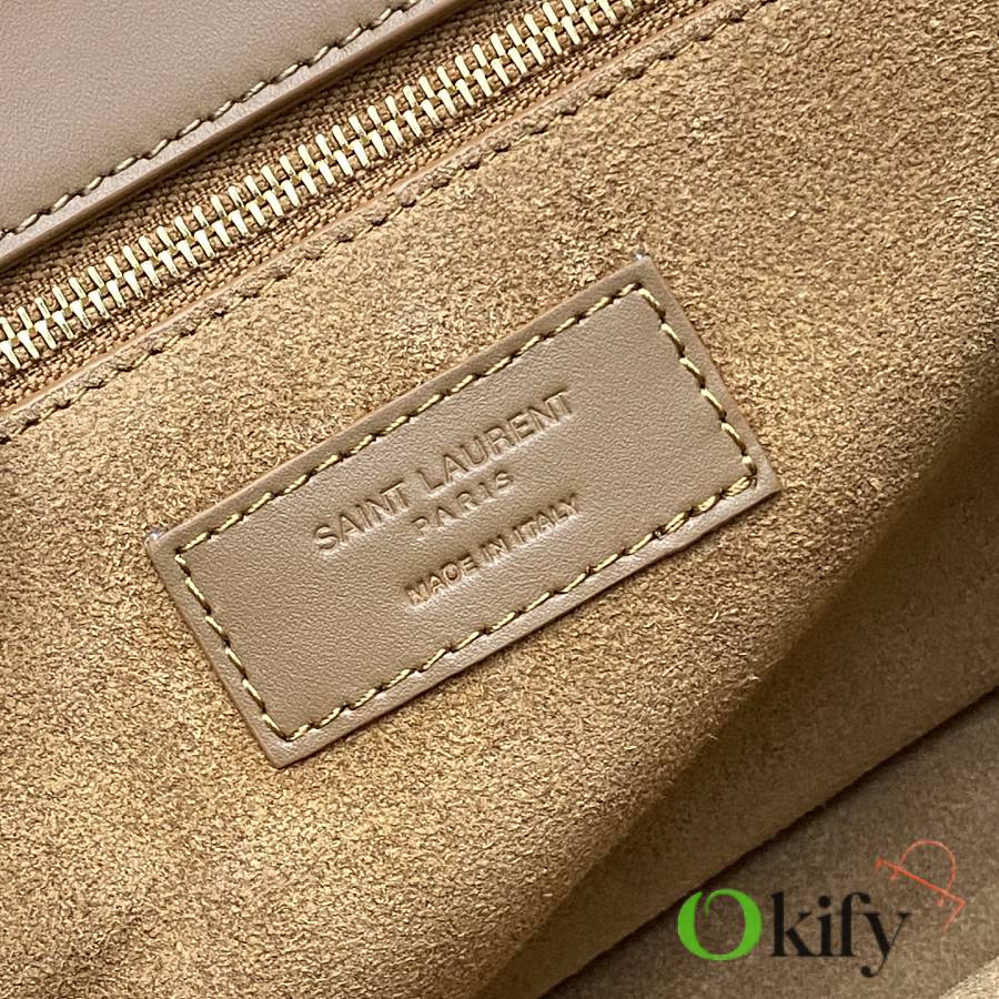 This new Saint Laurent Niki handbag comes in a unique new Besace saddle shape, crafted from caramel brown vegetable-tanned calfskin, featuring a soft heart-shaped flap closure and a YSL gold logo clasp. The bag offers two compartments and an adjustable shoulder strap, perfect for bohemian outfits or the Maillard look ideal for fall and winter, exuding a retro yet chic vibe.