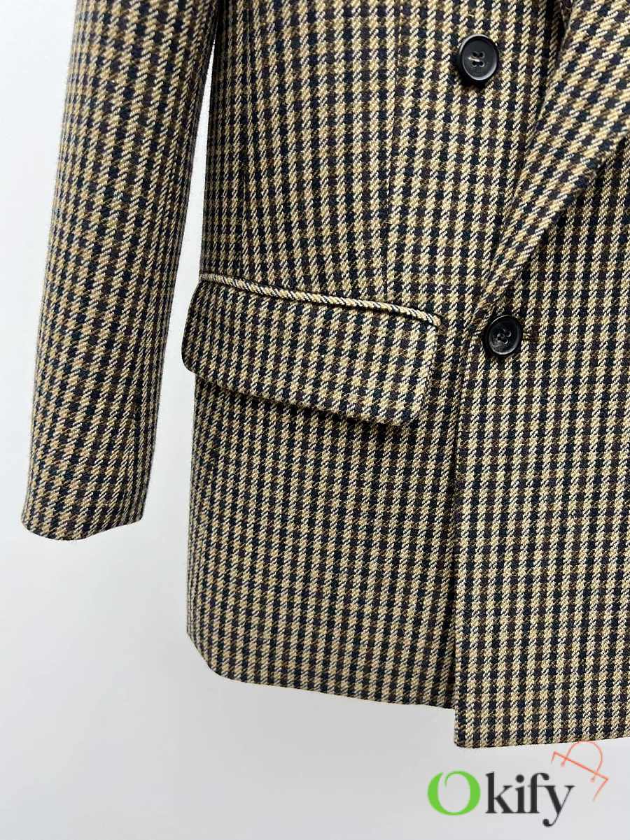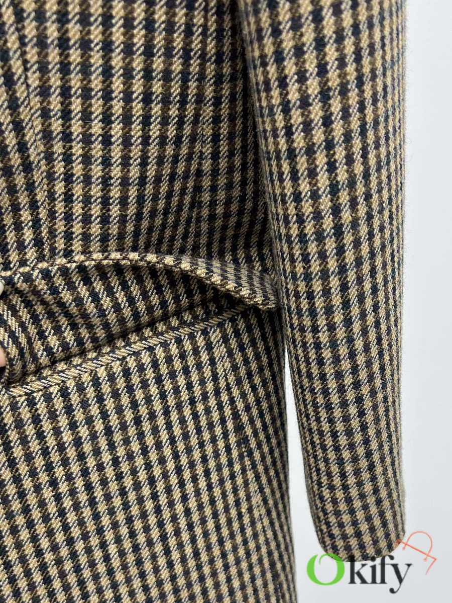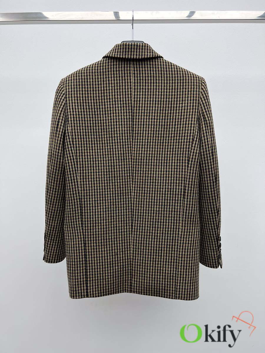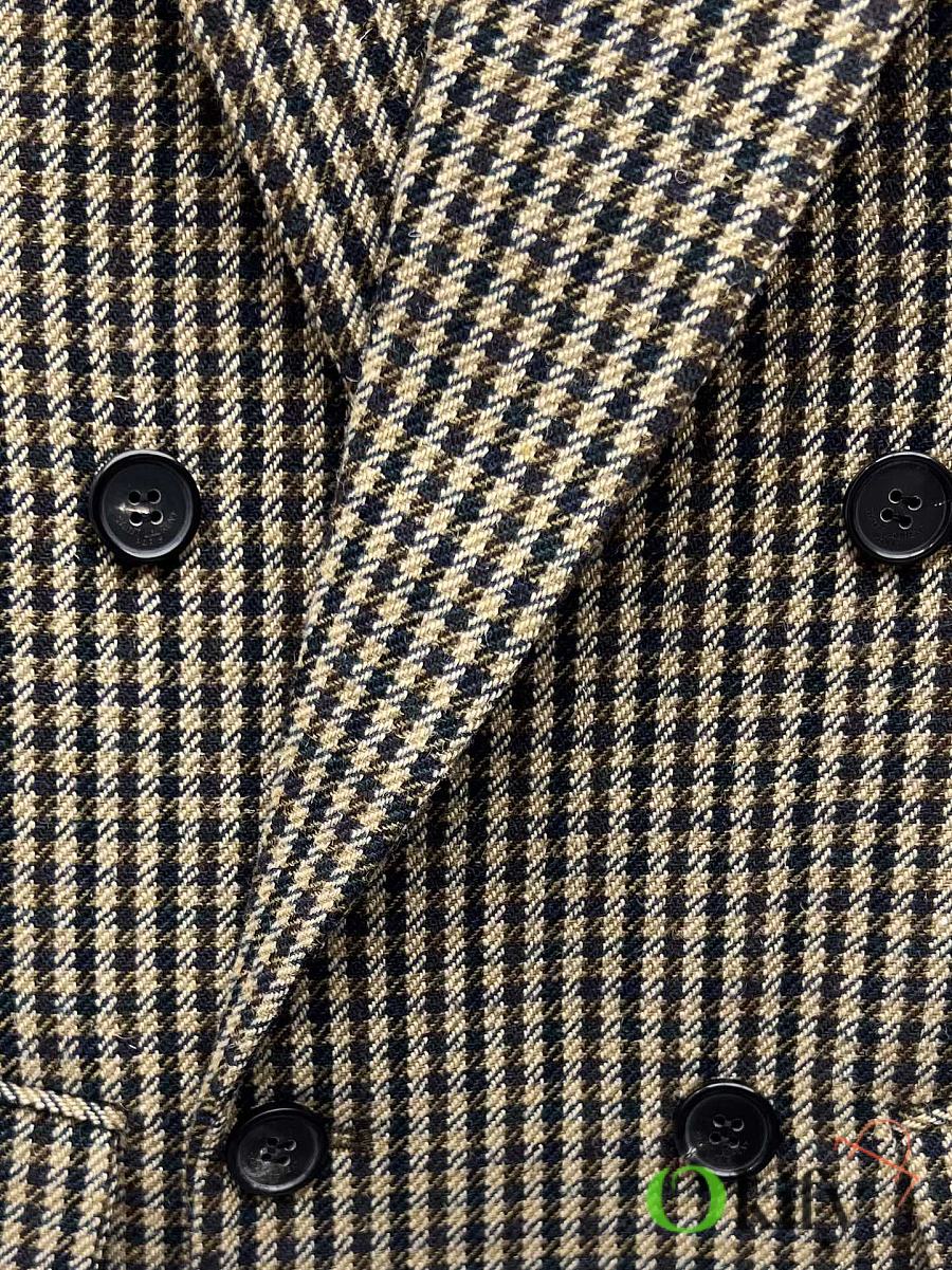 Check double-breasted four-button jacket Made of wool blend fabric Classic silhouette with padded shoulders and three-dimensional tailoring As always, the broad shoulders aura Retro elegance in the South of France
