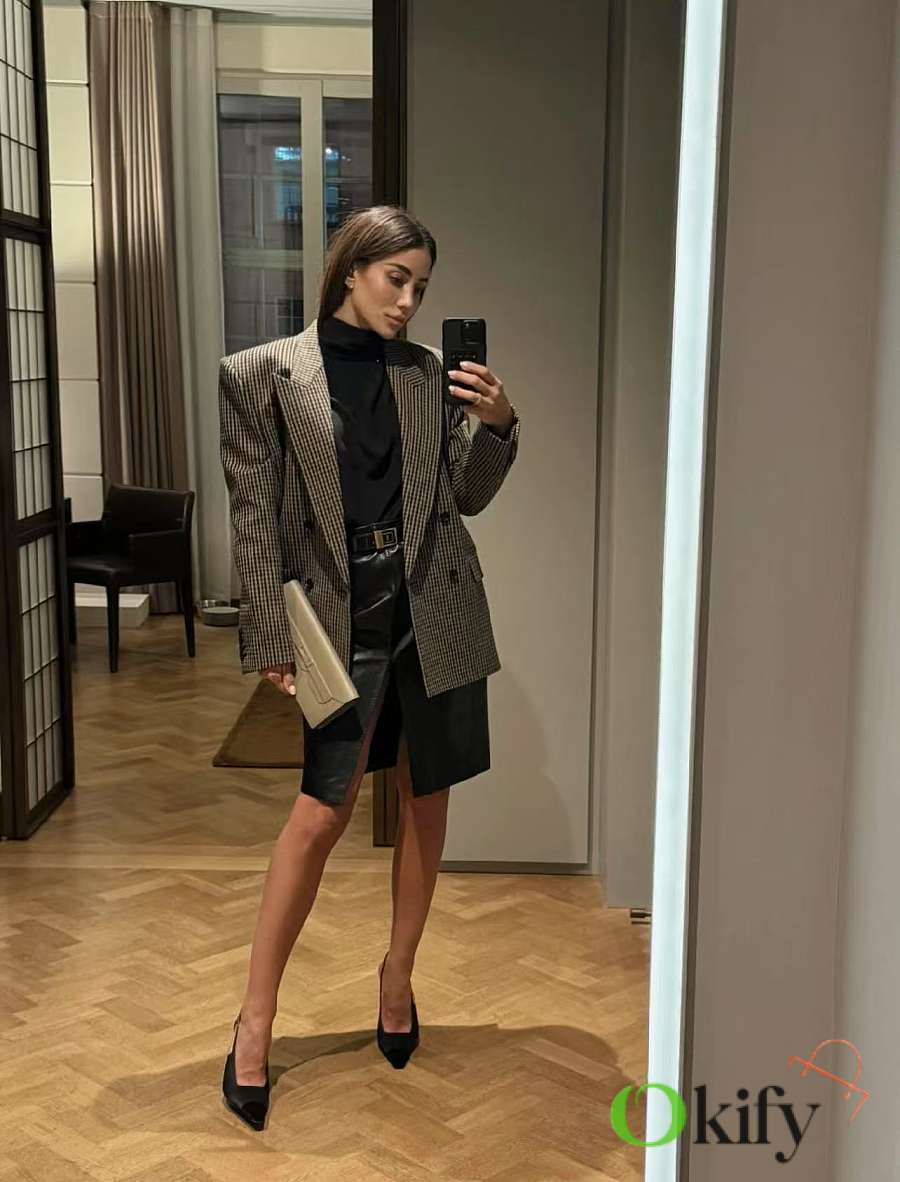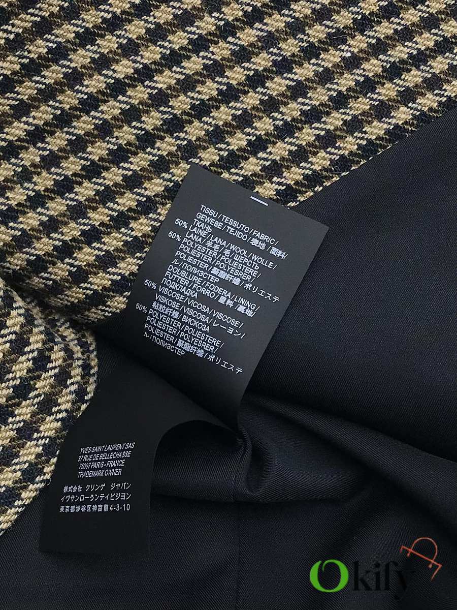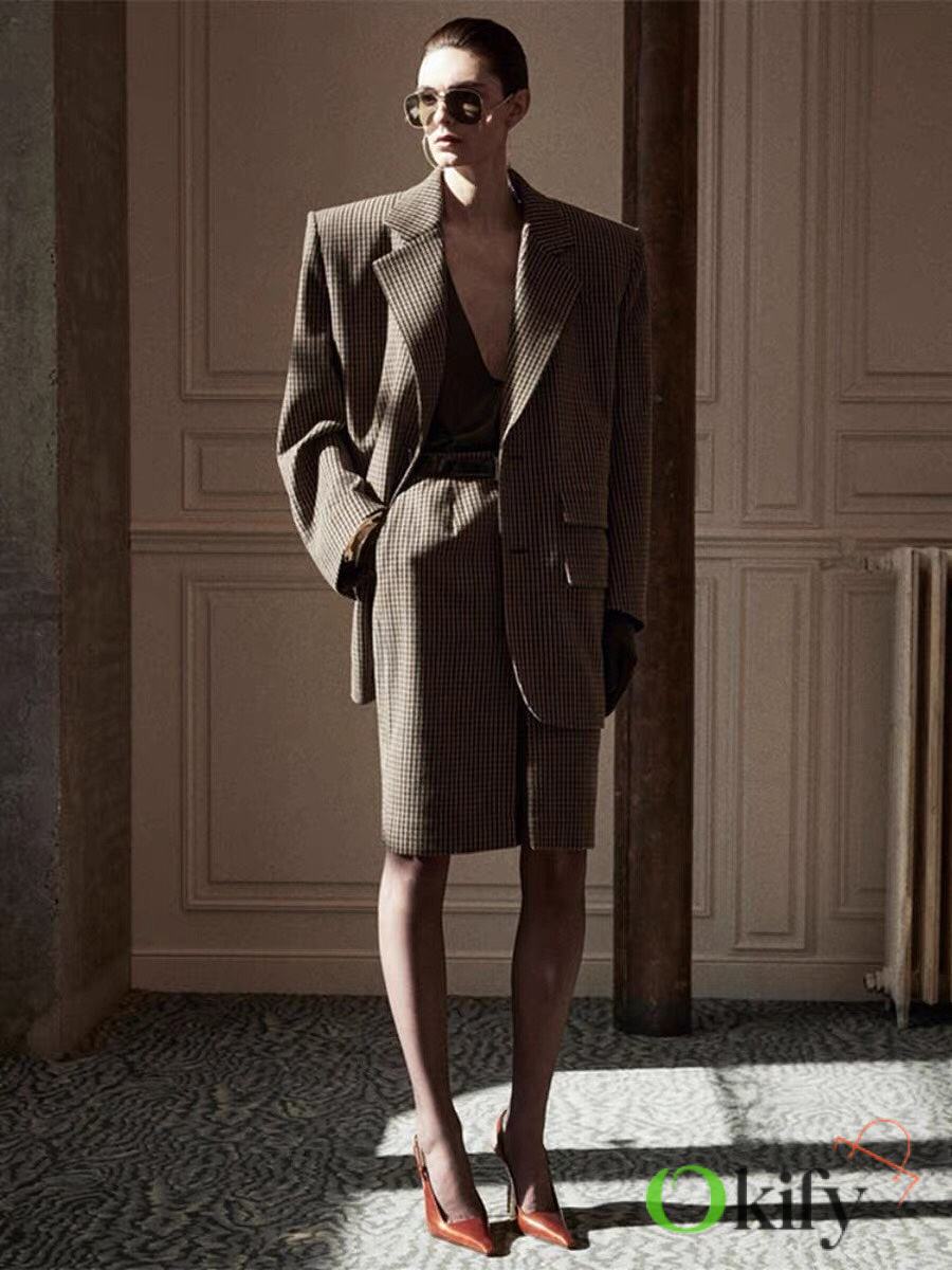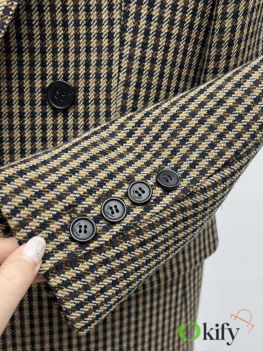 Check double-breasted four-button jacket Made of wool blend fabric Classic silhouette with padded shoulders and three-dimensional tailoring As always, the broad shoulders aura Retro elegance in the South of France