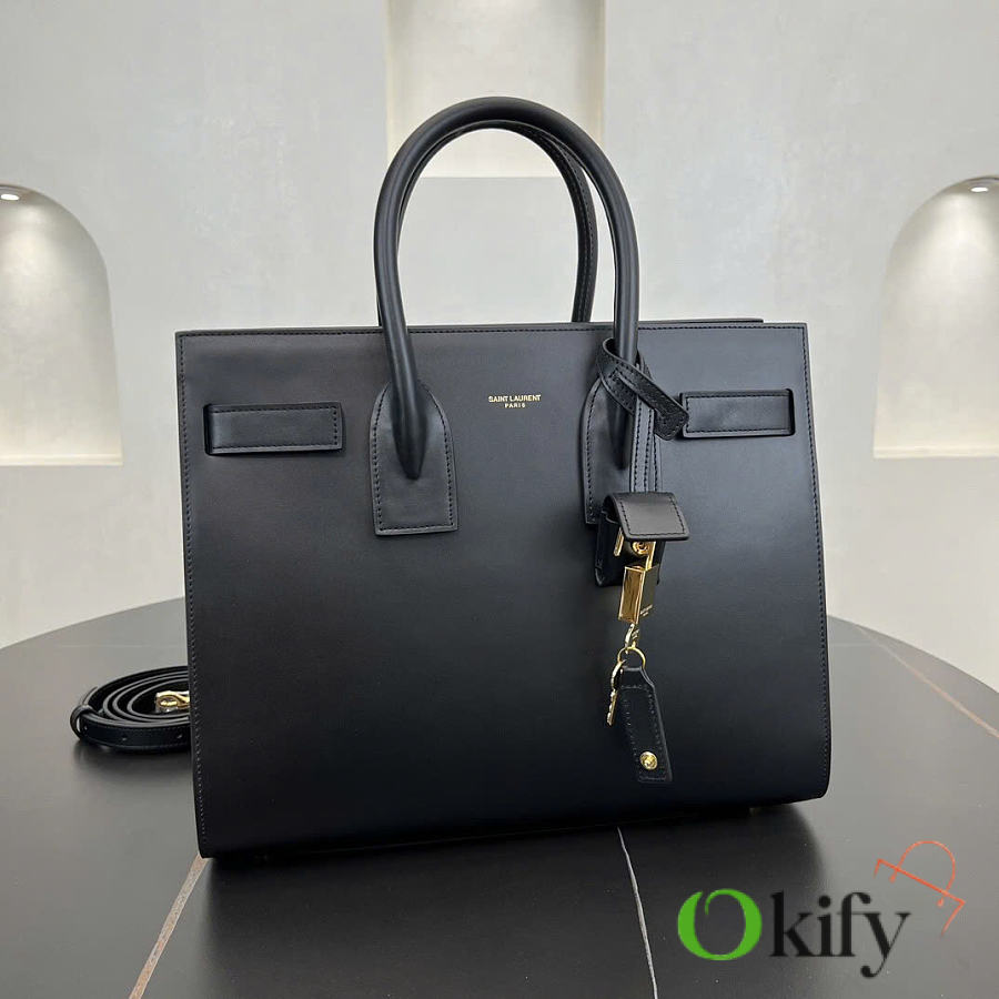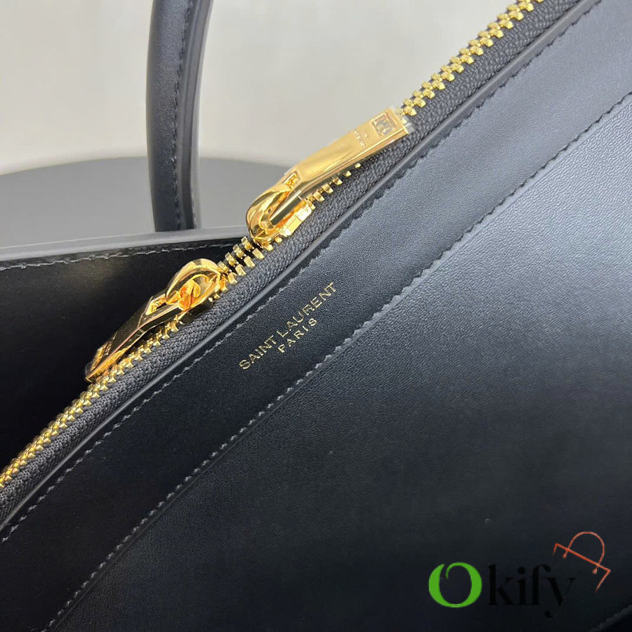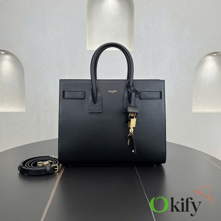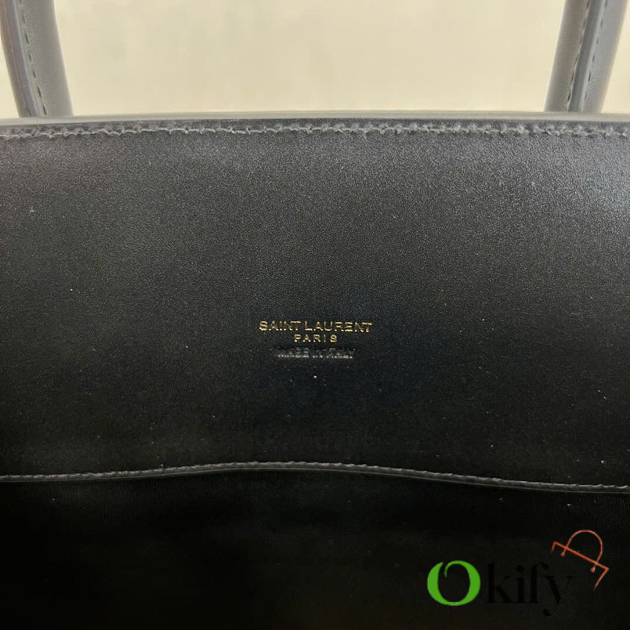 Features tubular handles, accordion-style pleats on the sides, an adjustable leather strap with a tag, engraved SAINT LAURENT logo, and a detachable shoulder strap. 100% calfskin leather lining. Interior features a central zippered compartment, two internal compartments, one zippered pocket, and a key ring. The key is secured to the inside with a padlock and snap closure.