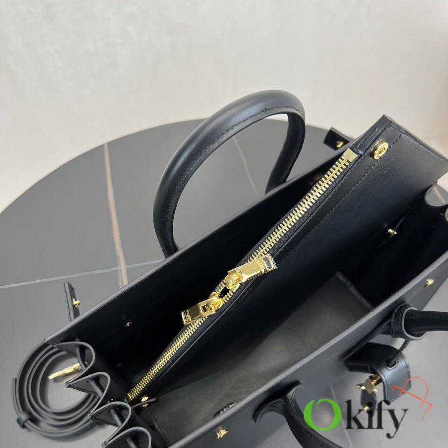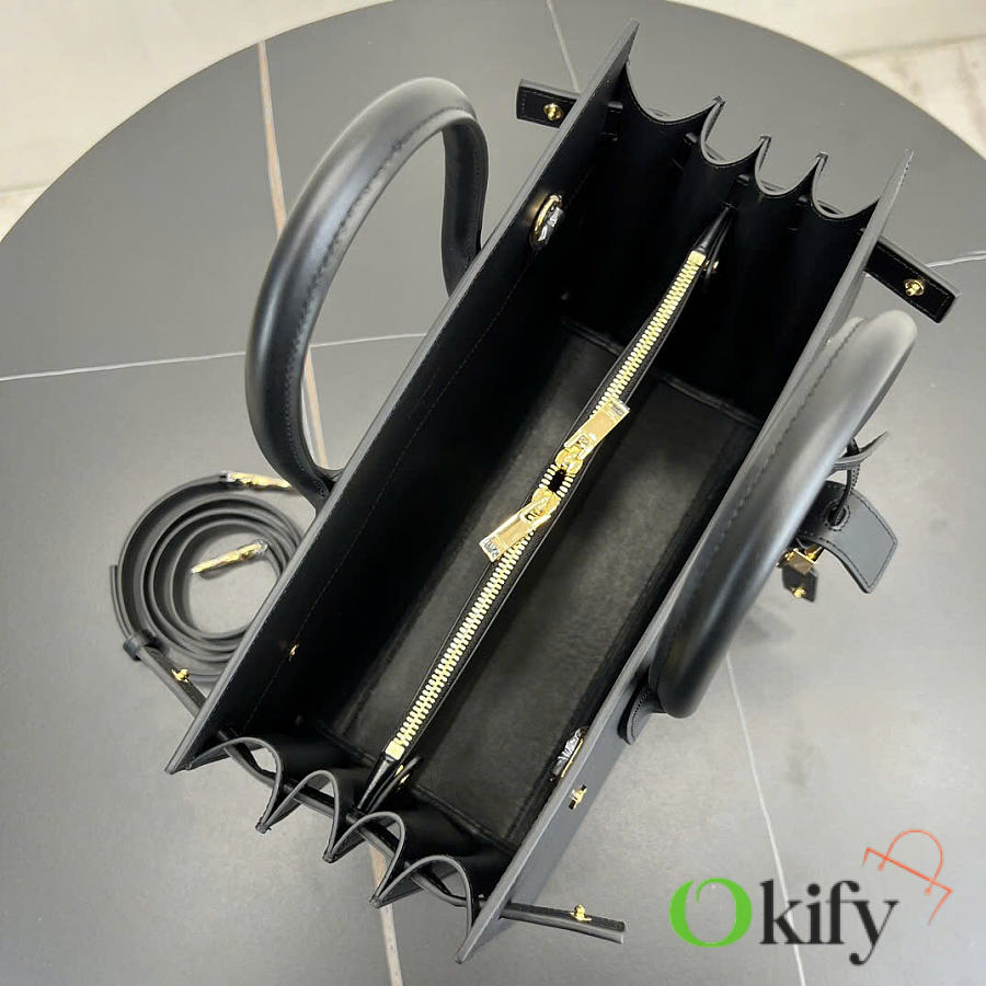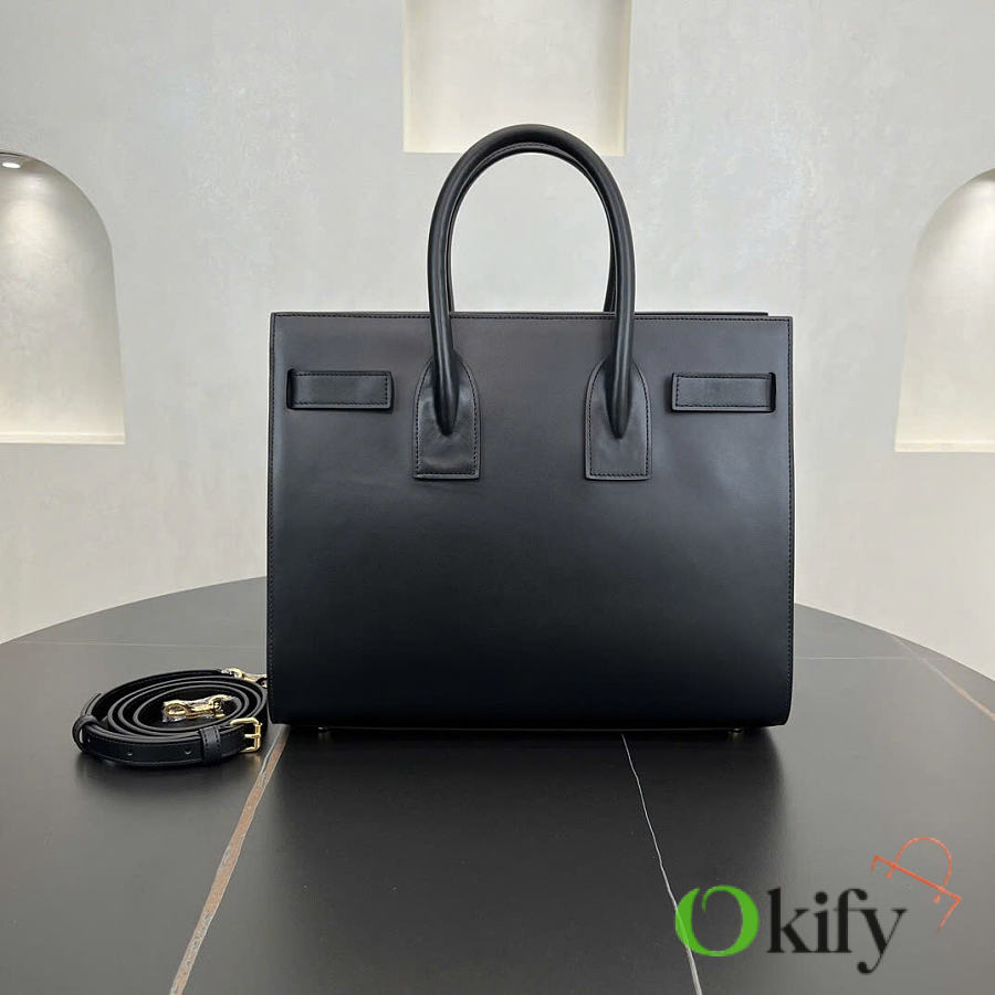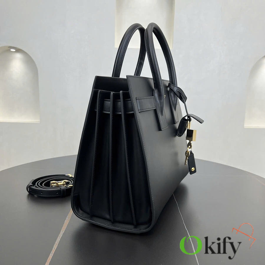 Features tubular handles, accordion-style pleats on the sides, an adjustable leather strap with a tag, engraved SAINT LAURENT logo, and a detachable shoulder strap. 100% calfskin leather lining. Interior features a central zippered compartment, two internal compartments, one zippered pocket, and a key ring. The key is secured to the inside with a padlock and snap closure.