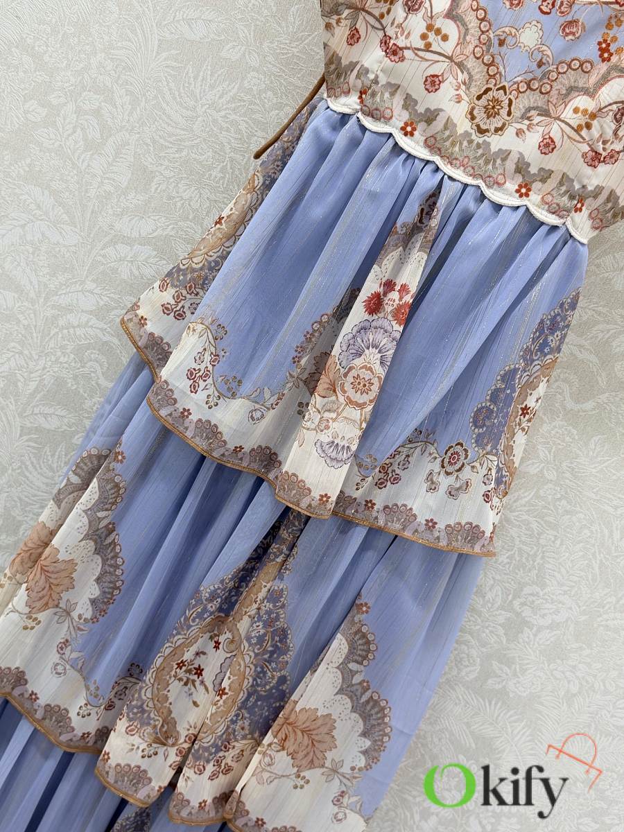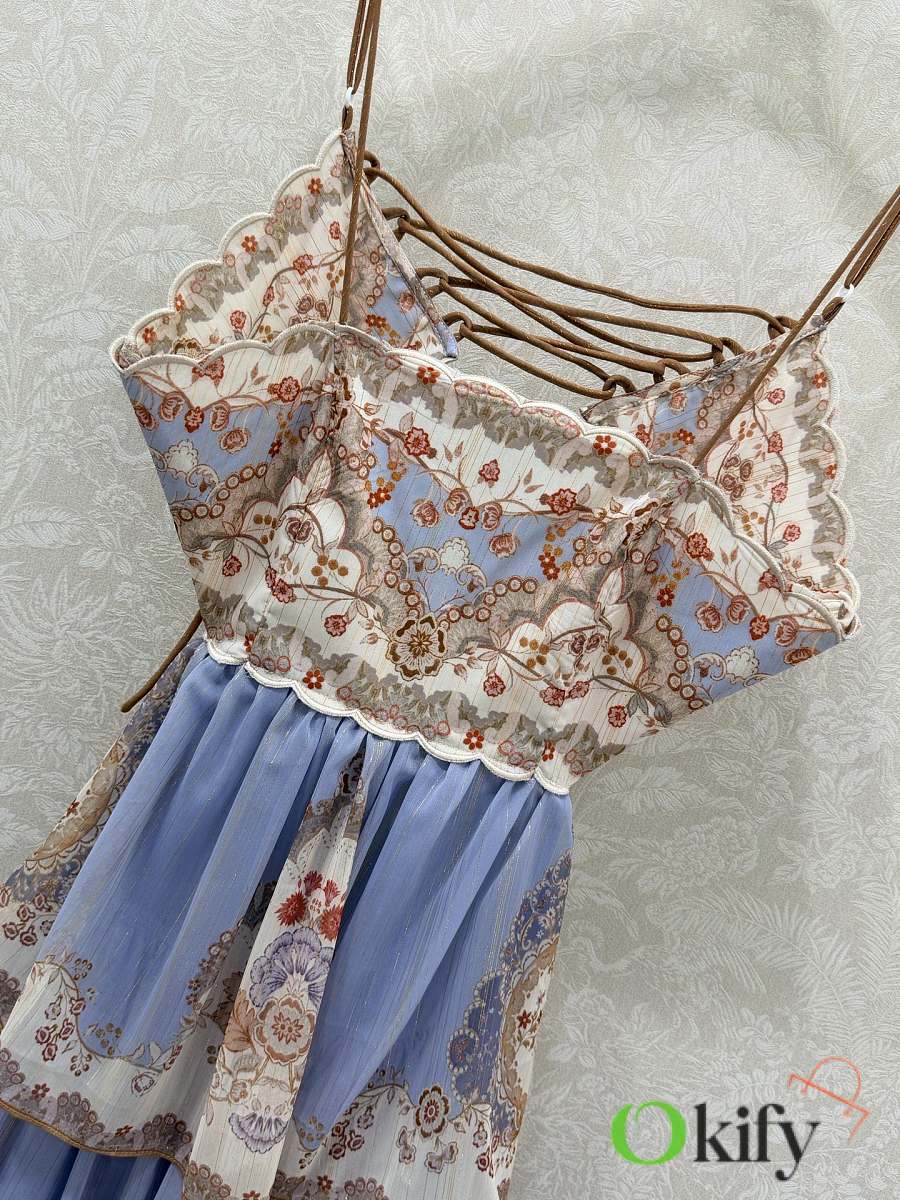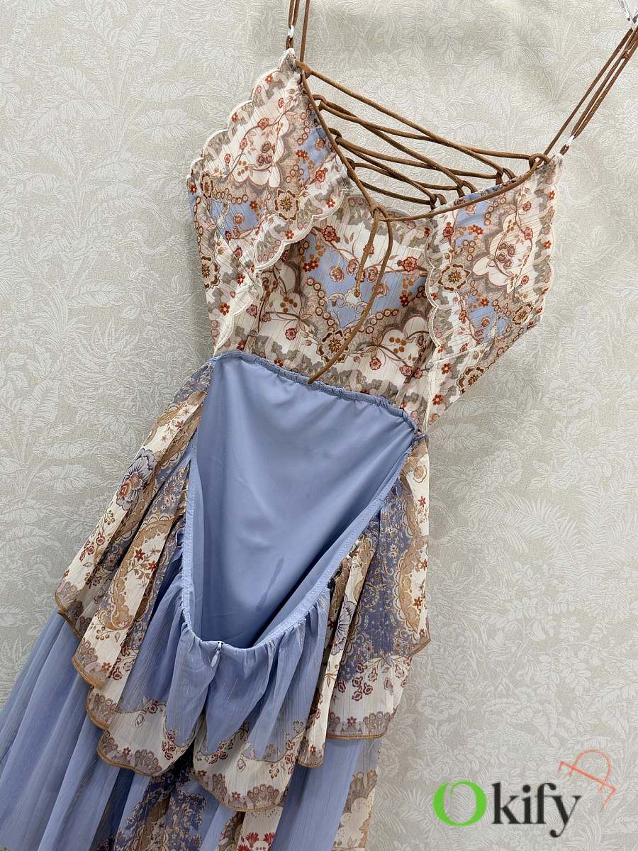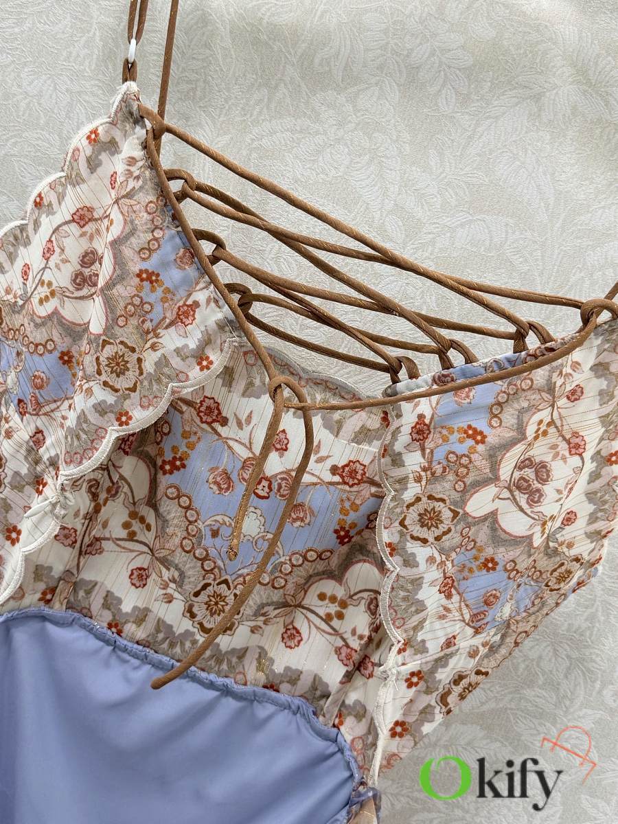 The dress features a crisscross lace-up back with a hollow-out design. The multi-layered cake skirt has a very large hem. The dress is made with ample fabric, exuding a lively and vibrant feel. The contrasting color print scattered across the blue skirt is perfectly balanced, making it comfortable and understatedly luxurious for everyday wear. The design is elegant and retro, perfect for a sweet and charming vacation look